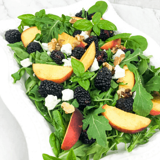 Blackberries are here in the salad and the tangy basil vinaigrette for this delicious salad with peaches and goats cheese